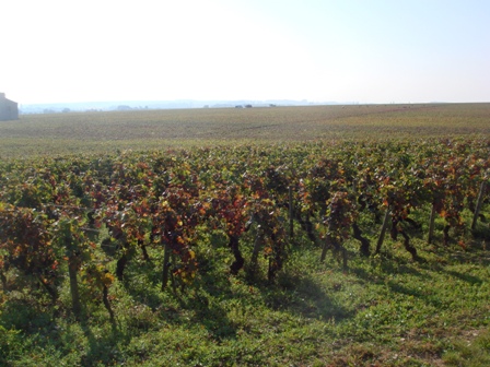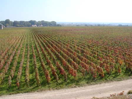 Par la fenêtre, je peux voir les vignes et les vendangeurs :