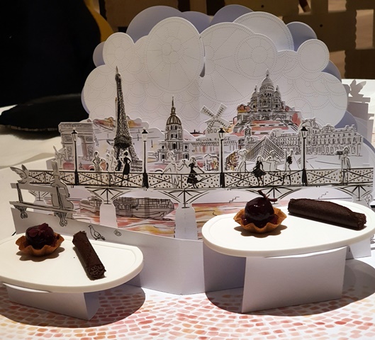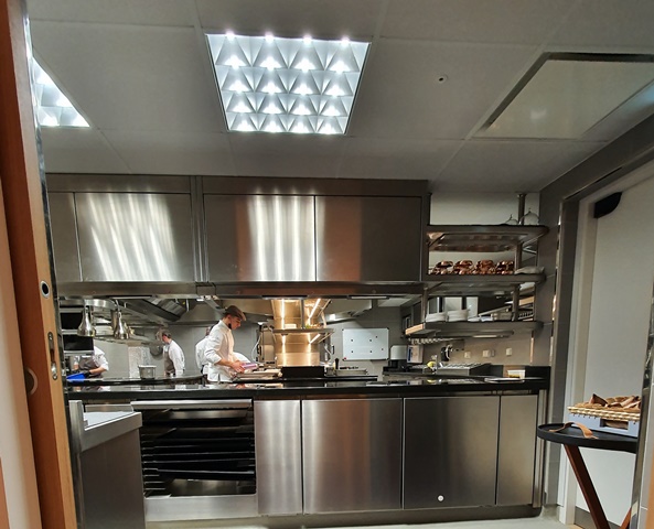 Il y a la place pour quatre personnes ce qui tombe bien. Nous avons la vue sur les belles cuisines où le personnel adopte un rythme plus lent après l’effervescence des plats à servir. Il faut dire que nous sommes largement après minuit. Arnaud Donckele tout souriant discute avec nous mais dresse les desserts et les sauces. L’émerveillement continue.
