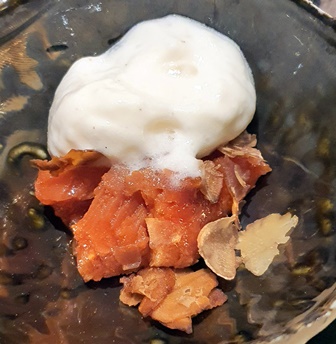 A gauche du menu il y a l’explication des sauces de chaque plat qui, dans le menu, sont précédées du mot « pour ». A titre d’exemple en voici deux : la vinaigrette « Berlugane » est : endocarpe de pamplemousse, mandarine et citron vert, gingembre, miel de fleur, infusion de marjolaine, mandarine Mikan, citron vert et orange sanguine pressés, huile de Bouteilhan, huile d’olive infusée à la mandarine, poivre de Sancho.