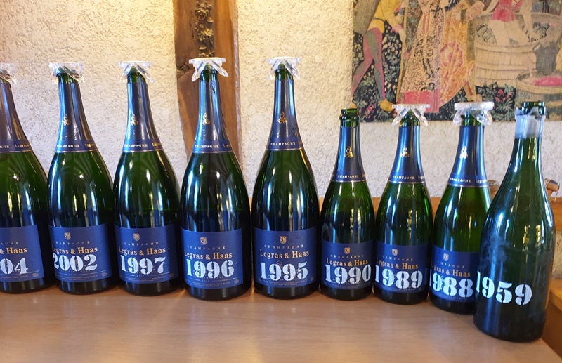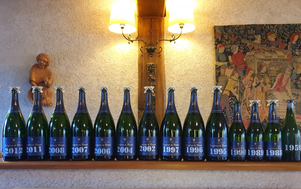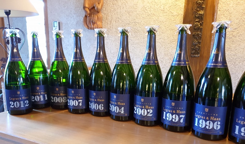 La maison de champagne Legras & Haas reçoit quelques-uns de ses importateurs et quelques amis en son siège à Chouilly pour une dégustation verticale de ses vins millésimés. Nous sommes une petite quinzaine réunis dans la salle de dégustation. Les vins les plus jeunes seront servis en magnums et dans des verres Zalto alors que les plus anciens servis en bouteilles seront versés dans des verres Lehmann conçus par Philippe Jamesse, l’emblématique sommelier de l’hôtel les Crayères.
