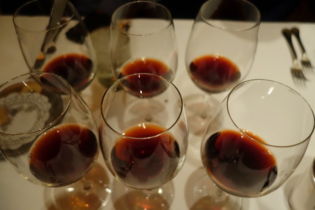 couleurs des vins au premier service dans l’ordre au premier plan Haut-Bailly 1913 / Pontet Canet 1916 / Latour 1920 (pour mon fils en face de moi, c’est l’inverse au second plan)