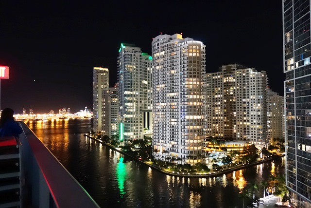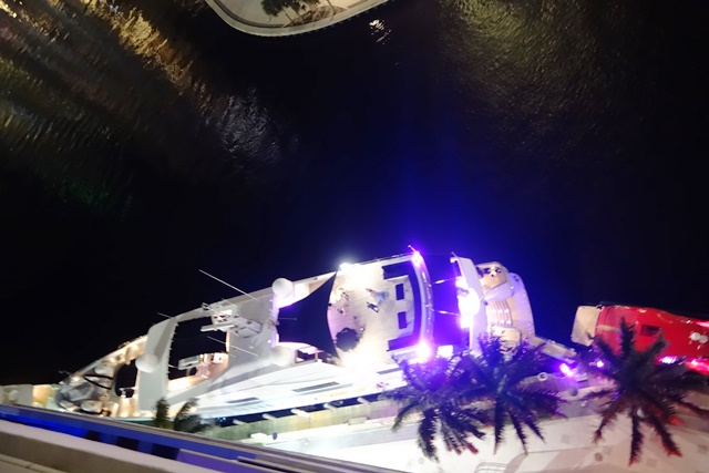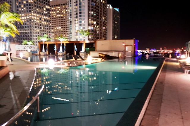 Nous allons au 16ème étage où il y a une piscine et plusieurs bars pour regarder les immeubles illuminés. On est à peine au tiers de la hauteur de l’immeuble mais d’ici, le grand bateau fait tout petit.