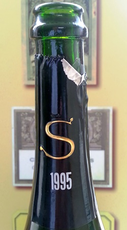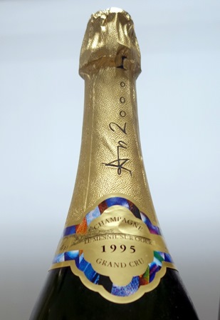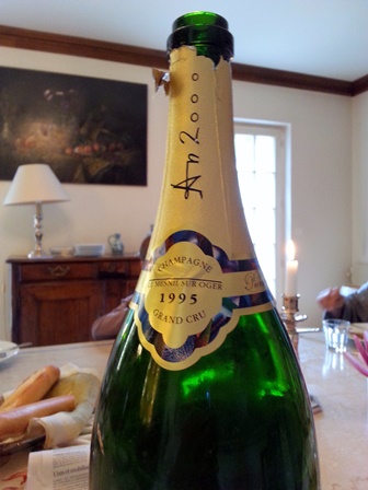 Nous n’allions pas en rester là ! Nous invitons ceux qui le veulent à finir la soirée à notre domicile. Nous avons prévu des petits fours salés et sucrés. J’ouvre un Champagne Pierre Péters Blanc de Blancs Jéroboam 1995 et quand je dis j’ouvre, c’est un euphémisme. J’essaie de tourner le bouchon et rien ne bouge. Les gros bras parmi mes amis me disent qu’ils veulent prendre la main mais sont aussi piteux que moi. Avec une pince à champagne nous essayons tout pour lever le bouchon qui ne veut pas venir. Il se cisaille et maintenant on a besoin de moi, car il faut lever le bas du bouchon. Le liège est tellement serré que piquer la pointe risque de faire descendre le bas du bouchon. J’arrive enfin à piquer mais le bas du bouchon ne veut pas remonter car le haut du goulot a une surépaisseur à l’intérieur du sommet. Au moment où j’arrive à surmonter cette difficulté, c’est la puissance du gaz qui expulse le bouchon.