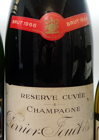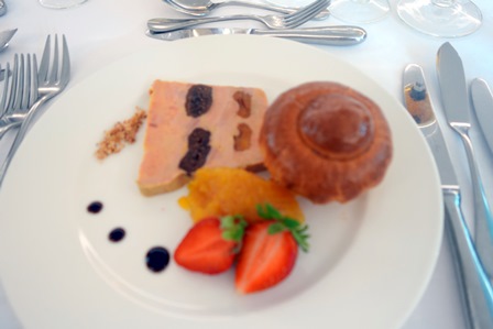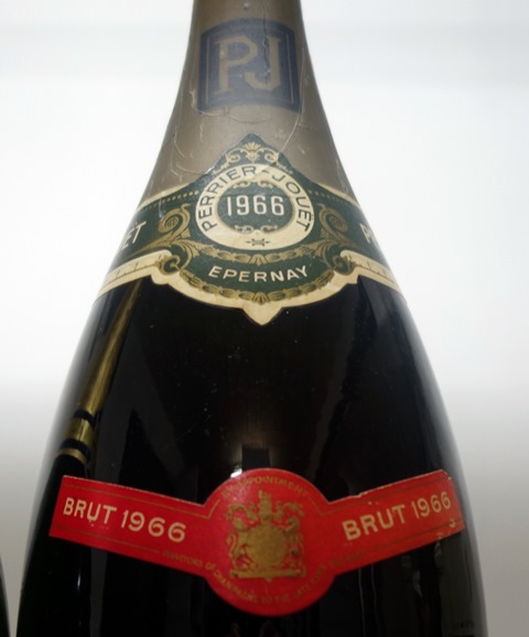 J’avais acheté le Champagne Perrier Jouët Mathusalem 1966 en vue de cette fête puisqu’il est de la même année que celle de notre mariage. La beauté de ce flacon qui contient huit bouteilles est photographiée par tous. Dans le verre le champagne est brun, et dès que la moitié du champagne est versée, les verres se remplissent de paillettes de poussières noires. Le champagne n’est pas inintéressant et se boit, mais il montre des signes de fatigue et une amertume qui limite le plaisir de sa douceur. Il aura quand même suffisamment d’énergie pour accompagner à table le foie gras.
