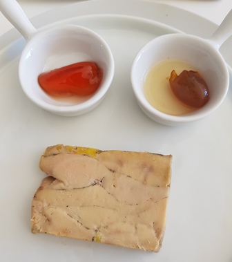 L’entrée est un foie gras agrémenté de kumquats confits du jardin et d’une gelée de coquelicot. Le Champagne Comtes de Champagne Taittinger 2005 est un champagne très agréable. Il a l’esprit d’un blanc de blancs dans une belle définition. Généreux, droit, flexible, il cohabite agréablement avec le foie gras.