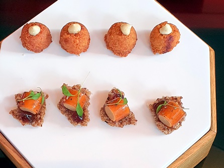 Le repas est un festival de saveurs et le menu est aussi long qu’un discours de Fidel Castro. Qu’on en juge : Œufs de truites et saumon sauvage marinés au saké et lait fumé / Biscotte végétale, pommade herbacée, parfum iodé / Anguille fumée et chocolat Pain viennois fumé au charbon, beurre demi sel au combava / Chair d’araignée au jus animal, pelamide mariné saké-betterave et garum d’huîtres / Semoule aux agrumes et fleur d’oranger, raifort et jus de carapaces / Moules, maquereau, hareng, noix de coco, condiment mojito estragon et jus vert / Focaccia au beurre noisette, piment d’Espelette-réglisse, beurre Nigelle et épices / Gamberoni, plancton, gel piment doux, beurre safran café, feuille de câprier Huître pochée, chou-fleur fumé, sarrasin torréfié, gel pimenté, voile marinière, poutargue / Caviar, langoustine, épinard- gingembre, brocolis, amandes, jus de queue de bœuf, beurre blanc café / Consommé de volaille infusé aux coquilles d’huîtres, dulce et écorces d’agrumes brûlées / Chénopode en tempura-vodka, œuf de brochet fumé, piment, poussière de carapace / Haricots verts à la flamme, pancetta de Bigorre, sucs d’oignons, cerise pimenté, jus de canard / Oignons, girolles, mortadelle au jus de queue de bœuf, chapelure à l’eau gazeuse et estragon / Fleur de courgette, pommade épices et noix de cajou, fruit de la passion / Epinard, vermicelles au curry, jus vert saté, jus de betterave Glace wasabi-raifort et diplotaxie / Framboise-Harissa Texture cannelée, tomatillo, tamarin hibiscus / Patate douce, mangue, dattes, eau de verveine / Banane fermentée, riz soufflé, cacahuète sucrée, kumquat / Sorbet ananas-safran, gel pimenté / Maïs givré, balsamique 25 ans, meringue maïs fumé grillé / Texture sablé-cigarette, pommade de patate douce aux épices, framboise, citron basilic / Avocat, perle de gingembre, fenouil, graines de moutarde / Mangue, goyave, poussière d’agrumes, patate douce et gingembre cristallisé / Palet glacé melon, eau de melon au curry vert, spray de gin d’agrumes.