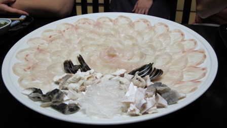 le poisson Fugu (devant, la peau, au centre les deux nageoires latérales et tout autour de fines tranches de la viande du poisson)