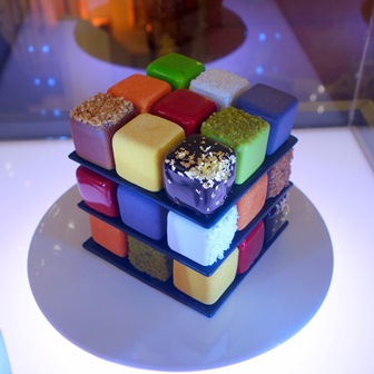 dans les vitrines les gâteaux qu’on ne peut goûter dont cet inventif Rubik’s Cube