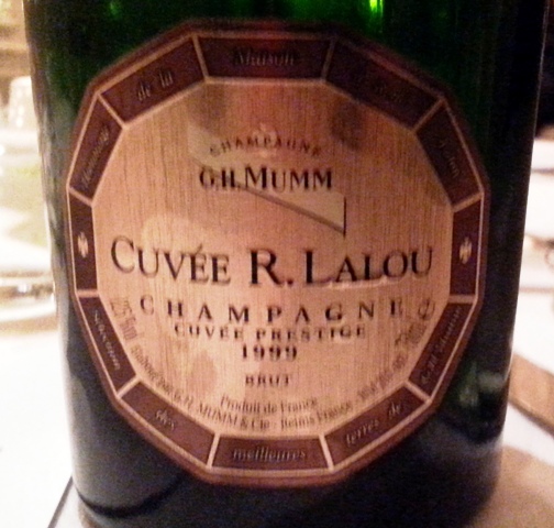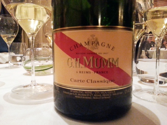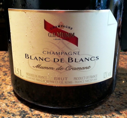 Le Champagne Mumm Blanc de Blancs Mumm de Cramant magnum sans année est pris à l’apéritif. C’est un champagne de soif bien agréable, sans longueur excessive, qui se reprend avec plaisir.