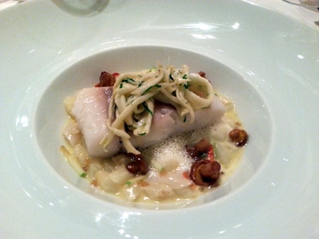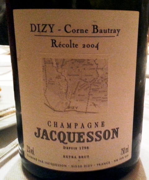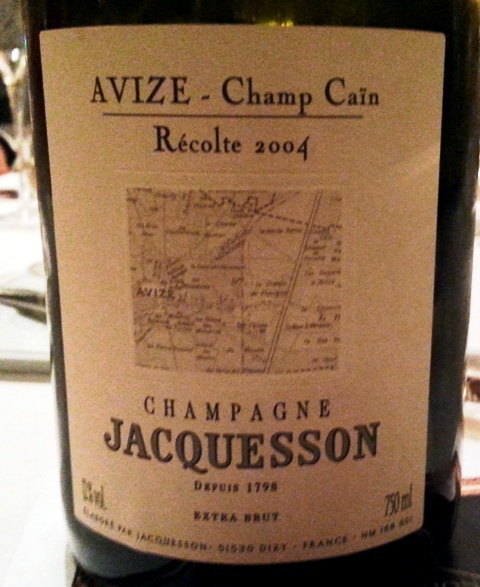 Le premier plat accueille un Champagne Jacquesson Dizy Corne Bautray 2004 d’une belle tension. Le Champagne Jacquesson Avize Champ Caïn 2004 est de la même veine que le précédent, affuté, et trouvant dans le bar un écho très favorable.