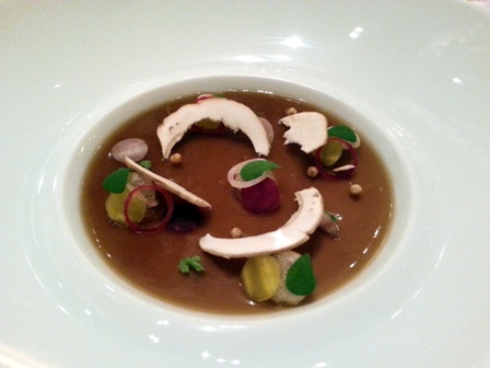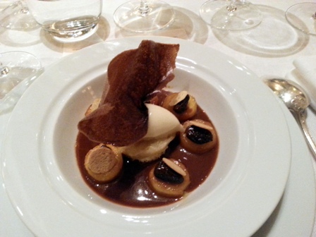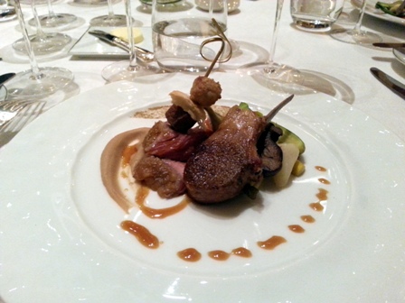 Les deux premiers plats sont de Philippe Mille et les deux suivants sont de Régis Marcon. Il s’agit de créations pour cette soirée. Il serait assez difficile de classer ces plats d’une créativité réfléchie. Chaque plat est porteur d’émotion. La royale de foie gras a un finale qui donne des évocations fruitées de pêches blanches que rien ne laisserait supposer, le dos de bar est d’une élégance et d’une justesse de ton exceptionnelle, l’agneau est d’une maîtrise qui fait comprendre pourquoi un chef peut obtenir trois étoiles et le dessert est probablement le plus abouti des quatre plats, avec une cohérence d’anthologie.