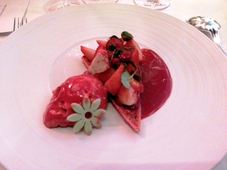 Nous passons à table et le menu conçu par Potel & Chabot est : brandade aux truffes, cocotte en croûte de sel / pigeon en feuilleté, duxelles de cèpes, jardin de légumes / macaronade aux deux fraises, fraises des bois givrées.