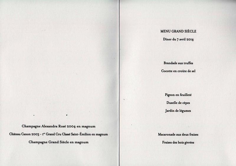 Le début du repas est accompagné du Champagne Laurent Perrier Grand Siècle aux facultés gastronomiques certaines. Vient ensuite, pour le pigeon le Château Canon Saint-Emilion magnum 2003. Il est jeune, bien sûr, mais il sait se tenir. Sa trame est forte, très truffée. Il tient bien sa place à côté du pigeon. Quelques années lui conviendraient bien, mais il apporte suffisamment de plaisir dans sa forme actuelle, tannique et truffée.