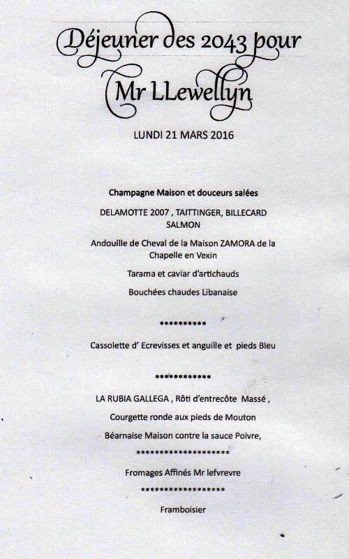 Le menu prévu par Thierry Leluc et le chef est : cassolette d’écrevisses, anguille et pieds bleus / la Rubia Gallega, rôti d’entrecôte massé, courgette ronde aux pieds de mouton, béarnaise maison et sauce poivre / fromages affinés / framboisier.