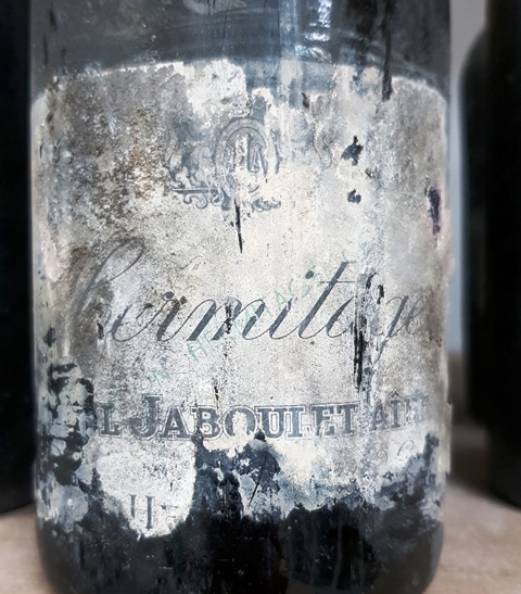 l’Hermitage Paul Jaboulet Aîné supposé 1915 avec l’étiquette illisible du vin servi et une étiquette lisible d’un vin du même lot
