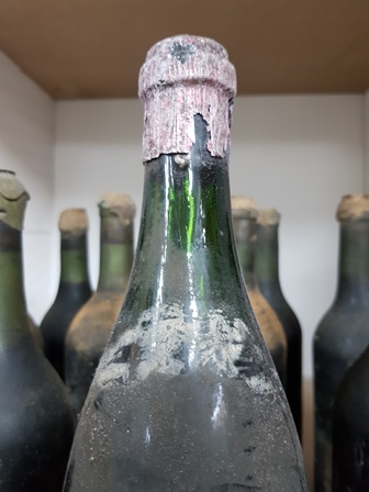 Je repère un Volnay Santenots Coron Père & Fils dont l’étiquette du millésime a disparu et dont la belle étiquette principale est décollée. A vue de nez le vin serait des années 50, mais le verre de la bouteille est bleu ce qui pourrait signifier années 40. Ensuite je repère un récent achat de cinq bouteilles d’Hermitage Paul Jaboulet Aîné dont tous les millésimes sont illisibles et quelques étiquettes sont elles-mêmes illisibles. Le vendeur m’avait dit qu’il s’agit probablement de 1939 mais en voyant les bouteilles, je pense que les vins sont beaucoup plus anciens. J’ai bu récemment un Hermitage La Chapelle 1938 qui paraît beaucoup plus jeune dans son habillage que ces bouteilles. Une chose est curieuse c’est que les capsules de ces bouteilles sont fripées comme des jupes plissées, et sont de couleur rose. Et le verre de la bouteille est très vieux. Alors, nous verrons à l’ouverture.