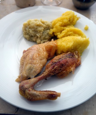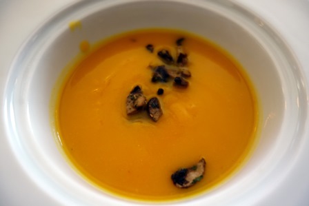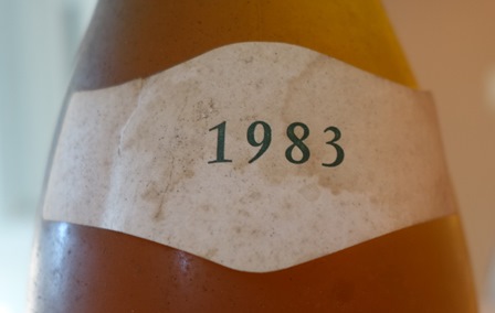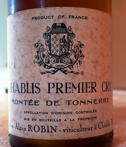 Le Chablis Premier Cru Montée de Tonnerre Alain Robin 1983 a été choisi car la couleur vue à travers le verre de la bouteille m’a semblé correspondre à celle du potimarron. Le niveau est parfait, la couleur est légèrement ambrée et sympathique et comme pour le champagne, c’est une belle surprise car le vin est franc. Le vin accuse son âge plus que le champagne et il est difficile de reconnaître en lui un chablis. On reconnaît plus un vin blanc à maturité, et ça lui va bien. L’accord avec le plat est très exact, les champignons donnant du liant.