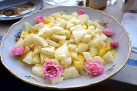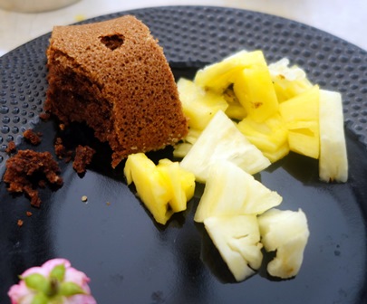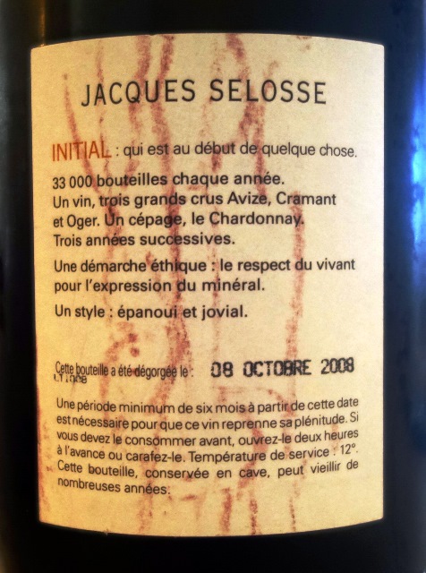 Trouver des vins qui accompagnent une reine de Saba et de l’ananas frais est une gageure. J’avais pensé prendre un Banyuls de 1949 mais il reste du vin rouge, aussi, même si ce n’est pas l’idéal, nous buvons le vin sur la pâtisserie discrètement chocolatée. Il est plus prudent de manger les ananas sans rien et le Champagne Initial Jacques Selosse dégorgé le 8 octobre 2008 apporté par un ami présent à table est bu avec les mignardises qui finissent le repas. Le champagne a une couleur légèrement grise et blanche, la bulle est bien active et le champagne est moins directement accessible que le Pommery. C’est un champagne intellectuel, moins joyeux et franc que les mêmes « Initial » que nous avons bus ensemble pendant l’été et qui furent délicieux. Ce champagne est bon, mais un peu énigmatique et ne se livre pas autant qu’on le souhaiterait.