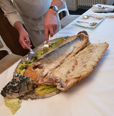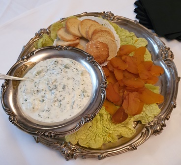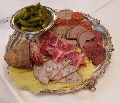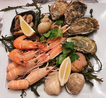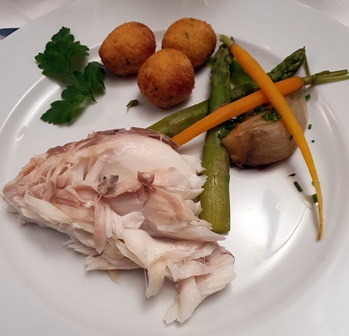Les hors d’œuvre d’apéritif sont copieux et délicieux présentés sur l’argenterie d’un bateau d’un membre du club. Il y a de la poutargue sur canapé avec une sauce pertinente, du homard, du thon fumé et des charcuteries fines dont de goûteuses andouilles. Le Champagne Bliard Moriset du Mesnil-sur-Oger est un blanc de blancs agréable.