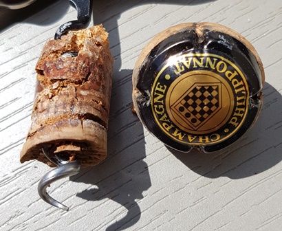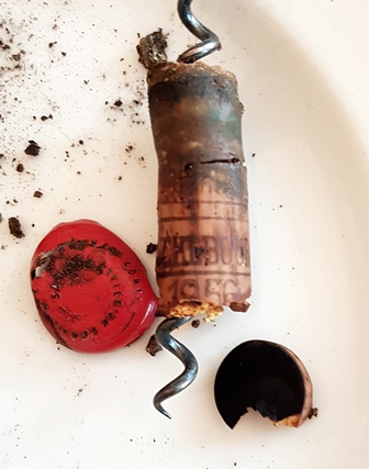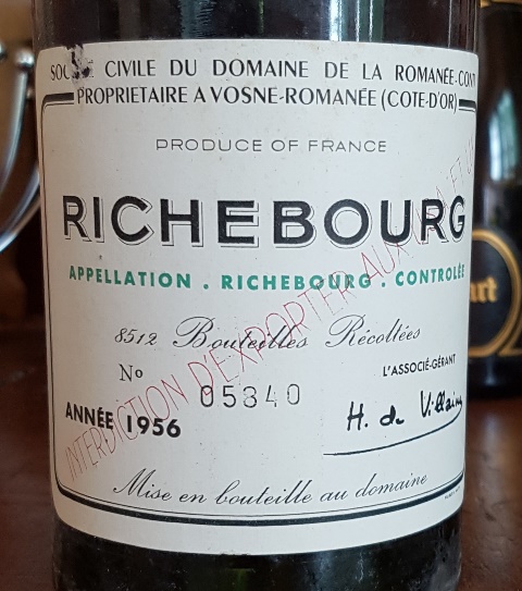 Le vin qui suit est d’une toute autre espèce. J’ai dans ma cave plusieurs bouteilles de Richebourg Domaine de la Romanée Conti 1956 et toutes ont des niveaux qui ont baissé. J’avais choisi la plus basse pour l’essayer avec mon fils seul, mais dans l’atmosphère familiale, j’ai pris le risque de servir ce vin pour tous mes enfants. Il a été ouvert trois heures avant qu’il ne soit bu. Le bouchon a sur sa surface sous la capsule une poussière noire qui ne sent pas la terre du domaine comme cela arrive souvent. Elle sent la poussière. Le bouchon est noir et sec, sans aucune exsudation graisseuse. Il est sec sur une moitié et d’un beau liège sur la moitié inférieure ce qui est encourageant. Le nez à l’ouverture est poussiéreux, mais tout indique que les choses vont s’améliorer. Et ce nez que je fais sentir à mon fils est tellement « continien » que nous sourions, ayant tous les deux le même espoir.