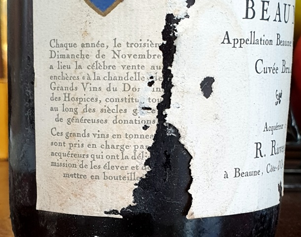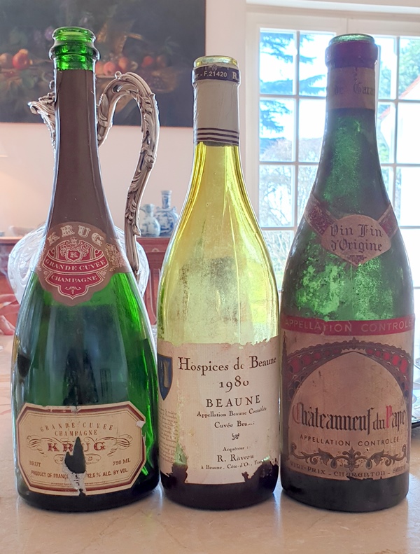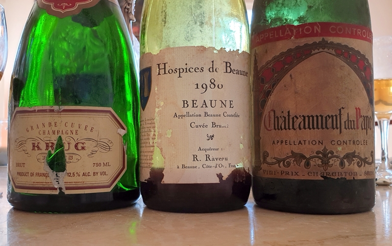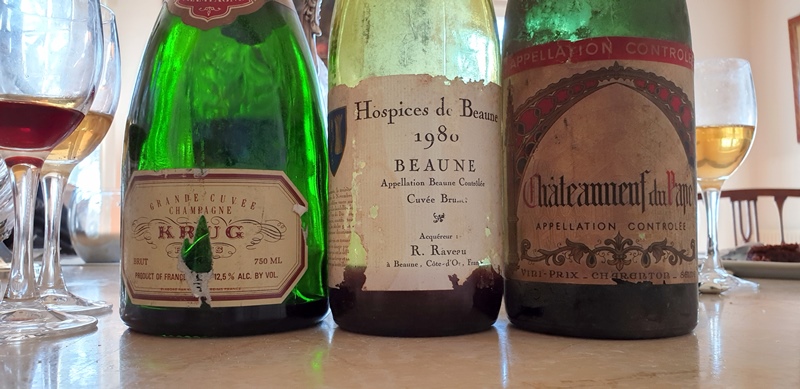 Les deux vins rouges ont été pris dans ma cave à l’instinct. Pourquoi eux, je ne sais pas. Je les ai carafés pour ne pas influencer l’opinion de mes filles. Le Beaune Hospices de Beaune Cuvée Brunet de R. Raveau 1980 a un nez discret et pur. Il annonce une belle subtilité. En bouche on sent un goût légèrement salé très agréable. Il n’est pas très large, mais il est plaisant.