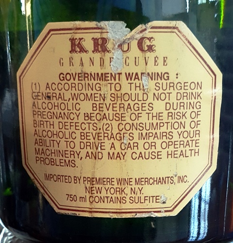 Le lendemain midi, le cercle s’élargit à ma fille aînée et ses deux filles. De tôt matin j’ai ouvert deux vins rouges assez inhabituels que j’ai envie de goûter avec mes filles, « pour voir ». Pour l’apéritif qui consiste en des petits crackers pimentés puis deux belles quiches lorraines, j’ai ouvert un Champagne Krug Grande Cuvée étiquette crème qui a plus de vingt ans. La bulle est grosse, mais c’est sans doute lié au verre qui est un verre plutôt fait pour les rouges. La couleur est légèrement et joliment ambrée. D’emblée, l’attaque du champagne vif est noble. C’est un chevalier paré de son armure étincelante qui entre en lice pour emporter le cœur de la dame de ses pensées. Il est puissant, racé et complexe mais il est rassurant. Le champagne accompagne ensuite un cœur de saumon fumé gras et délicieux, mais il était plus à son aise sur la quiche. C’est un champagne de grand raffinement et intense.