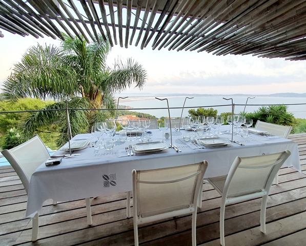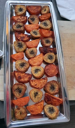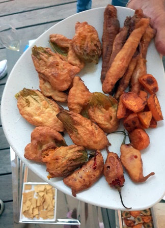 Le dîner du lendemain du 15 août se tient chez des amis qui ont participé au dîner du 15 août et au déjeuner au Mirazur. Notre groupe de six est le même. Des carottes et tiges de maïs se trempent dans une goûteuse anchoïade, des petites gaufres, des tranches passées au four de bananes plantain et de patates douces, des tempuras de fleurs de courgettes et autres beignets forment un apéritif gourmand.