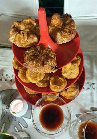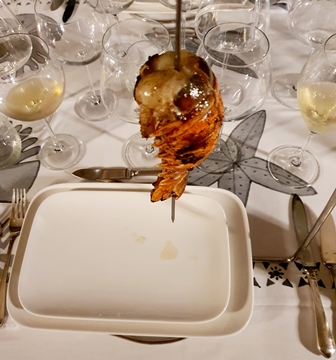 Sur une plancha électrique des langoustes cuisent, traversées par de longues piques. Et quand nous passons à table, la pique pend à la place de chaque convive, soutenue par une potence. Ce qui permet à la maîtresse de maison de faire suinter sur chaque queue de langouste une sauce complexe à la vanille et d’autres épices. C’est du plus bel effet et la langouste est parfaitement cuite et assaisonnée.