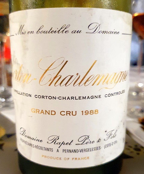 Le Corton Charlemagne Domaine Rapet Père & Fils 1988 est joyeux, large sans être opulent comme les plus grands Corton Charlemagne. Il joue bien son rôle et l’accord langouste vanillée et ce beau blanc épais fonctionne bien.