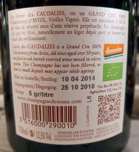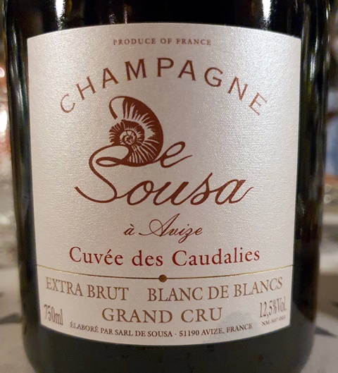 Le Champagne de Souza Cuvée des Caudalies Blanc de Blancs sans année mis en bouteille en 2014 et dégorgé en octobre 2018 est d’une grande vivacité. J’aime son entrain, sa pertinence, et sa belle énergie. C’est un grand blanc de blancs très cinglant.