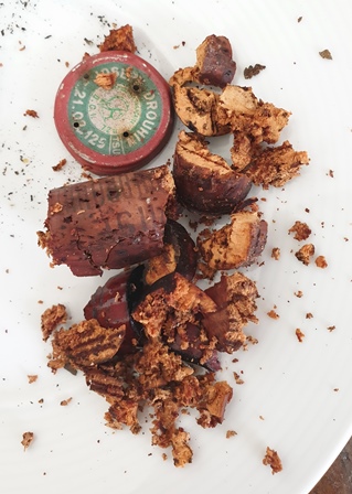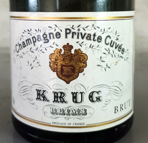 L’apéritif consiste en des petits crackers tartinés d’houmous, de la rillette de sardine, un fromage au pesto et un fromage aux orties. Le Champagne Krug Private Cuvée doit dater des années 60 ou du début des années 70. Le bouchon se brise à la torsion et je récupère la base du bouchon avec un tirebouchon. Le pschitt est quasiment inexistant mais une fine bulle est visible dans les verres. Le champagne est magnifique, profond, riche et ce qui frappe c’est un fruit doré imposant. Ce champagne gourmand et vif est un champagne de plaisir.