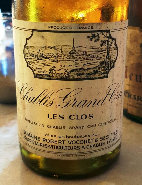 J’ouvre un Chablis Grand Cru Les Clos Robert Vocoret & Fils 1971. Le niveau est beau, la couleur est claire, le nez est expressif. Le vin est superbe. C’est la forme la plus aboutie d’un Chablis Grand Cru. On se régale avec ce vin qui est généreux. Le cœur de filet de saumon le rend encore plus vibrant.