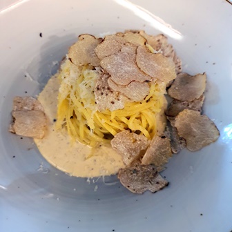 Nous avons le choix entre plusieurs menus et nous nous mettons d’accord pour prendre le menu à la truffe blanche sauvage d’Alba. Il est ainsi rédigé : apéritif de bienvenue et amuse-bouche / filet de veau à la piémontaise aux truffes Tuber Magnatum Pico / nos pâtes aux truffes Tuber Magnatum Pico / homard bleu de Bretagne tout simplement rôti accompagné de sa bisque légère et râpée de truffe Tuber Magnatum Pico / prédessert / les douceurs récréatives.