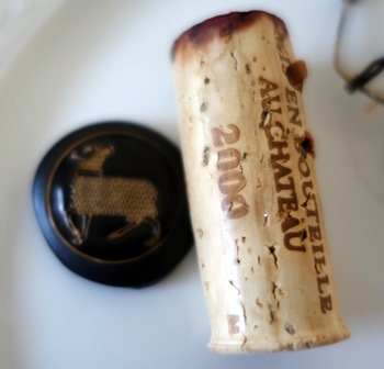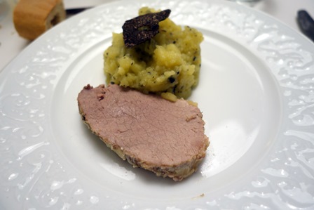 Le Château Mouton-Rothschild 2000 a un nez percutant. Je ne m’attendais pas à autant de richesse et d’ampleur dans ce vin qui a de beaux tannins et évoque la truffe. Ce vin puissant a aussi beaucoup de charme. Il évoque aussi le tabac et la mine de crayon. C’est un grand Mouton, avec de beaux fruits noirs, et une belle mâche, qui me fait une belle surprise en se situant à ce niveau. Le grenadin de veau et sa purée sont exactement faits pour accompagner le Mouton.