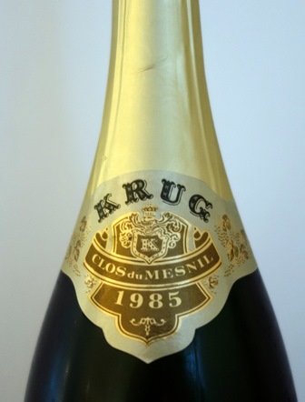 Le Champagne Krug 1985 est merveilleux. Si l’on devait donner la définition d’un champagne idéal, on prendrait celui-ci. Le précédent explore des voies nouvelles alors que celui-ci solidifie les bases fondamentales des grands champagnes. Il est vineux, fort et complexe, d’une grande richesse en bouche. Un petit côté exotique s’illustre par un goût de figue. Il accompagne élégamment les belles huîtres dont les belons sont les plus fortes et goûteuses.