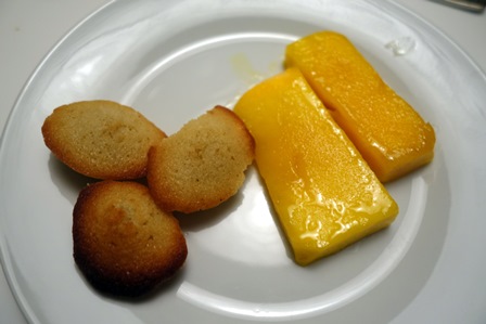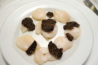 L’apéritif se prendra avec deux jambons espagnols très différents, un foie gras légèrement truffé sur des morceaux de baguette que nous recouvrirons de lamelles de truffes. Le menu sera : trois sortes d’huîtres dont chaque convive aura deux pièces, des belons, de Gillardeau et des Isigny / damier de coquilles Saint-Jacques crues avec des tranches de truffe / camerones / grenadin de veau avec un écrasé de pommes de terre aux copeaux de truffes / fromages vache et brebis / Stilton, bleu de Termignon et bleu de Gex / tranches de mangues poêlées / madeleines au miel.