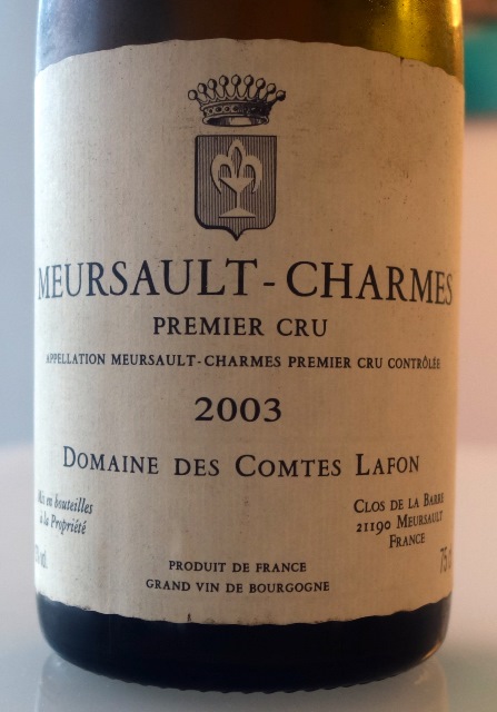 Le Meursault-Charmes 1er Cru Domaine des Comtes Lafon 2003 est d’une belle richesse opulente. Il tapisse la bouche et s’y installe. Il a à la fois une belle minéralité et un gras sensuel. C’est un beau vin blanc joyeux, parfaitement adapté aux coquilles et un peu moins au foie gras même s’il lui convient.