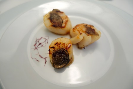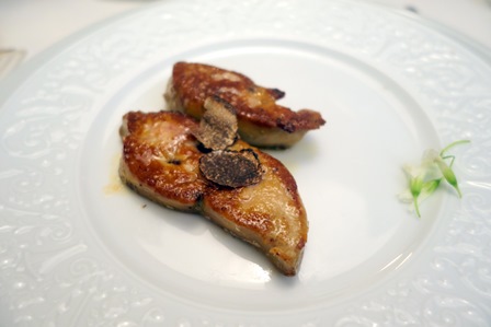 Nous passons à table. Ma femme a prévu : coquilles Saint-Jacques / lobes de foie gras poêlés avec des lamelles de truffes / gigot d’agneau basse température avec des panais poêlés / variété de fromages / suprêmes de pamplemousse rose avec kumquat confit et safran du jardin / financiers et petits fours secs.