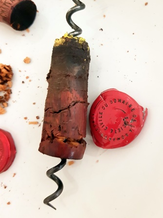 Je peste car la qualité des bouchons des deux vins de Bourgogne est notoirement faible. Lorsque je veux piquer mon tirebouchon dans le bouchon du 1957, le bouchon glisse vers le bas. J’essaie de piquer et quand je tourne le tirebouchon, le bouchon tourne, sans que je puisse enfoncer le tirebouchon. Il a fallu plusieurs minutes avant que je ne puisse enfoncer le tirebouchon et lever le bouchon, noir sur plus de la moitié de sa longueur et ayant déposé du gras sur le goulot. L’odeur du vin est épouvantable, la poussière dominant. Cette odeur a tellement pénétré le vin qu’il me paraît impossible que le vin revienne à la vie.