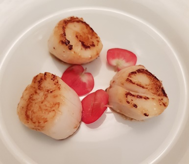 Nous passons à table après que chacun a résolu une énigme lui permettant de trouver sa place et voici le menu que j’ai mis au point avec mon épouse qui l’a réalisé : caviar Osciètre seul / Caviar Osciètre sur coquille Saint-Jacques crue / Coquilles Saint-Jacques poêlées / Corail des coquilles Saint-Jacques / Filets de dorades royales poêlés / Médaillons de faux-filet de bœuf / écrasé de pommes de terre à la truffe / Camembert Jort boîte bois / Suprêmes de pomelos / Mangues / Madeleines au miel de châtaignier.