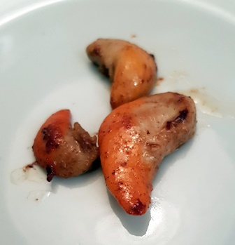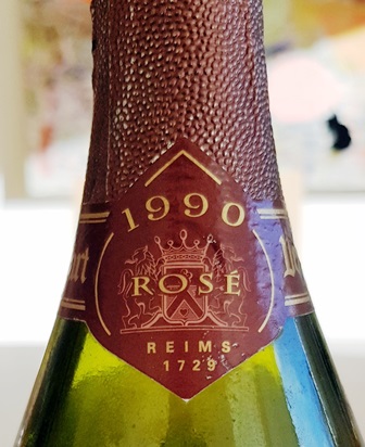 Les petites madeleines au miel sont à se damner. Le Champagne Dom Ruinart rosé 1990 à la jolie bouteille est hélas bouchonné. Si on accepte de boire le champagne, en oubliant l’amertume créée par le bouchon, il y a une fraîcheur très significative qu’offre le champagne. Mais il est inutile d’insister.
