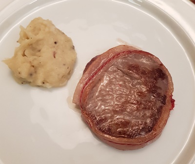 Je verse le vin à tout le monde ainsi que les deux autres vins. La viande est parfaitement cuite et la purée truffée est suffisamment typée mais calme pour jouer le rôle d’accompagnement des vins.