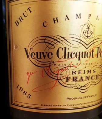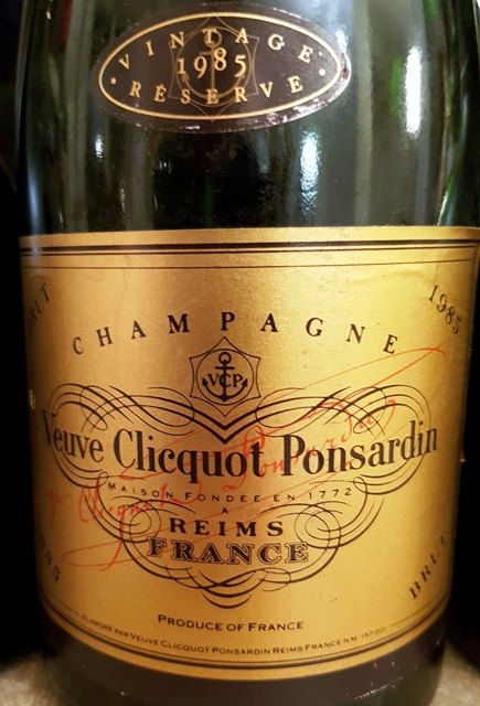 L’apéritif commence avec le Champagne Veuve Clicquot Ponsardin Vintage magnum 1985 qui accompagnera du boudin blanc truffé poêlé en fines tranches, une chiffonnade de Cecina de León, cette délicieuse viande fumée de bœuf, et le pain apporté par une amie restauratrice. Le « pain pompe » est servi traditionnellement le 24 décembre. Il est fait de farine versée sur le fond de la meule lorsque le pressage de l’huile d’olive est terminé, qui va « pomper » la fleur d’huile de fond de cuve et permettre ce pain spécial à la fleur d’oranger.