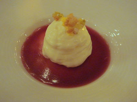 Meringue soufflée aux framboises rafraîchie au lait de coco, élixir au gingembre