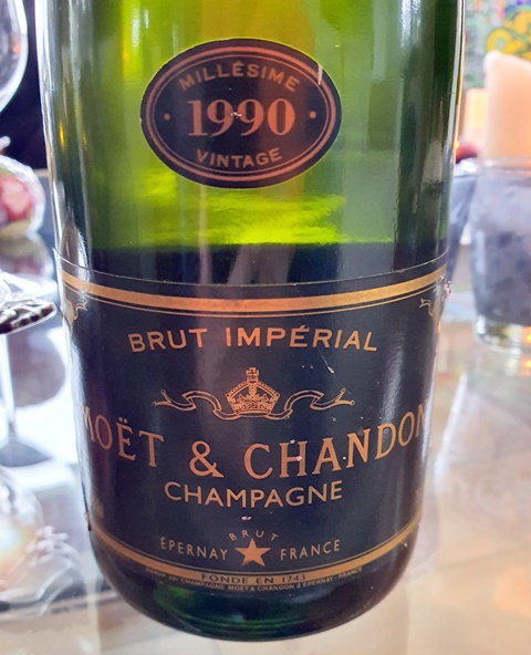 A l’apéritif où nous grignotons des chips de toutes formes, sarrasin, truffe, nature ainsi que des amandes salées, j’ai ouvert un Champagne Moët & Chandon Brut Impérial 1990. Sa couleur est claire et belle, le pschitt est très affaibli mais la bulle est bien présente. Ce champagne est confortable. Il a une maturité idéale qui lui donne de beaux accents de jeunesse. Il est gourmand, long très agréable.