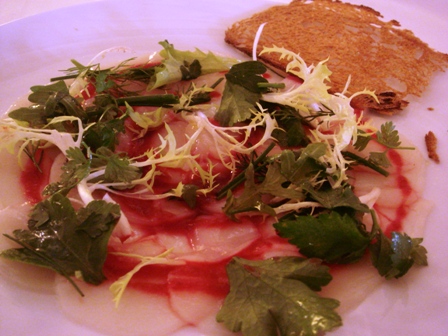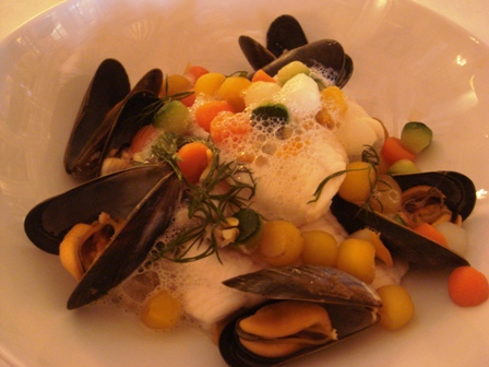Carpaccio de coquille Saint-Jacques et filets de sole (les moules ne sont pas annoncées, malgré les intitulés assez longs de la carte).