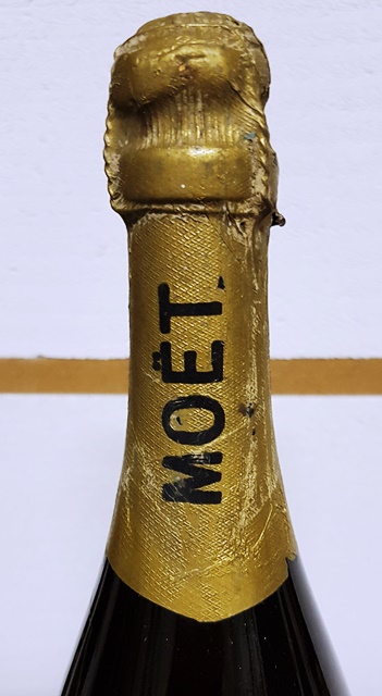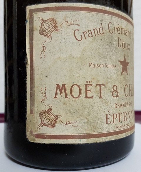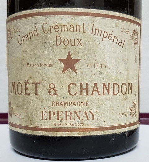 Three examples : one Champagne Moët & Chandon Grand Crémant Impérial Doux. The archivist of Moët says that this bottle was commercialised between 1941 and 1948. Crémant means that the pressure is weaker than for other champagne, giving a less active bubble, and « doux » means a very sweet champagne.