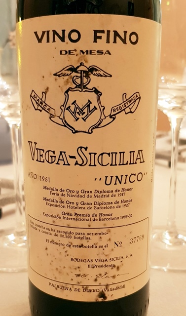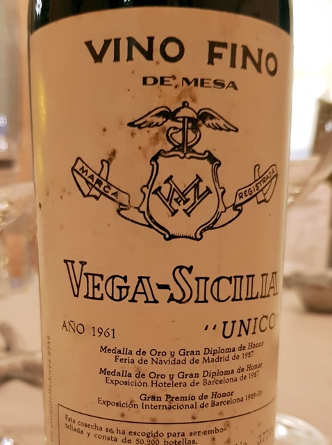 J’avais prévu d’ouvrir pour mon fils Vega Sicilia Unico 1961 avant la présentation des vins de Vega Sicilia par Gonzalo Iturriaga maître de chais du domaine, car j’aurais aimé lui en parler, mais les événements en ont voulu autrement aussi est-ce seulement le lendemain de la présentation que nous allons boire ce vin à dîner. Pour être sûr de ne pas ouvrir trop tard ce grand vin, si j’étais pris au bureau trop tard, c’est à 9h30 du matin que j’ai ouvert le vin, laissé ensuite en cave à 14 degrés. Le parfum en cave est prometteur.
