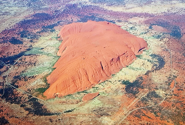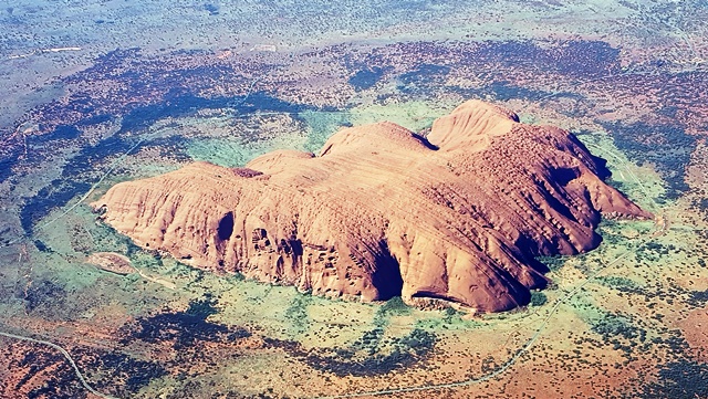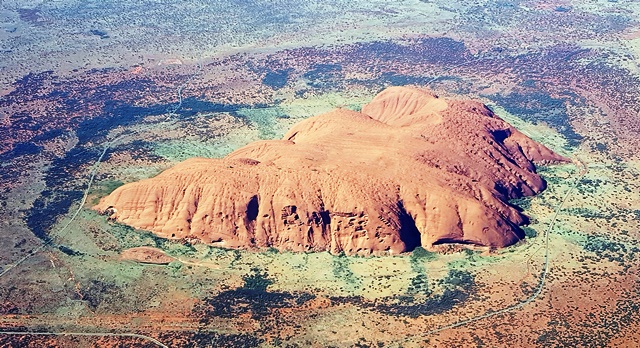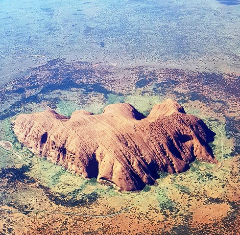 survol grâce à une modification du plan de vol de notre avion qui volait à 11.000 mètres, est descendu à 3.000 mètres et a tourné autour de ce « caillou » sacré pour les aborigènes.