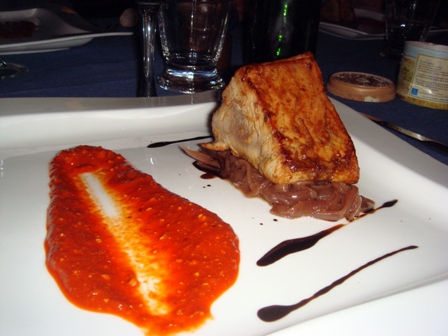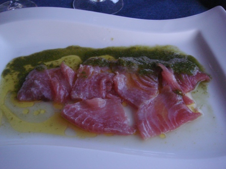 Yvan nous apporte un carpaccio de poisson rouge de Méditerranée à la tendreté redoutable sur un pesto délicieux mais légèrement acide. Le champagne réagit bien, et c’est le Chevalier-Montrachet Bouchard Père & Fils 1998 qui dompte le plat de façon parfaite. Il y a dans ce vin un parfum intense et un goût envahissant. L’image qui me vient est celle de l’archange Saint Michel terrassant le dragon. La chair est irréellement bonne, comme une hostie sur la langue en partage eucharistique.